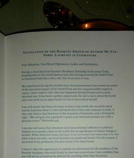 有进入晚宴现场的媒体拍摄了莫言致辞的英文版本。从图片中可以看到,莫言一开始表示获得诺贝尔奖这件事像是“天方夜谭”(a fairy tale),但确实是事实。这几个月的经历对他来说是个绝好的机会——让他了解这个世界,也更好地了解自己。
