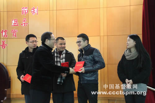 副院长王以诺牧师宣布了获得2015年春季学期奖学金的学生名单。院长潘兴旺牧师、副院长王以诺牧师、院长助理林新鲁牧师分别向获得一、二、三等奖的同学颁发了奖学金。