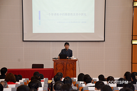 中国社会科学院世界宗教研究所基督教研究中心唐晓峰主任进行题为《学者眼中的基督教中国化》的讲座,他分析了基督教为什么中国化,他还指明,基督教应该由谁来中国化以及基督教界在中国化过程中所要承担的工作有:1.经典的译介,2.教义、教理的诠释,3.教义、教理的宣讲,4.以行证道。他以“基督教中国化这个概念是超越党派利益、宗派利益、学术意义,基督教中国化不是政治口号,不是学术术语,某种程度上也不仅仅是信仰实践,它代表着一种关系和解,是基督教与中华民族、中国文化、当代中国社会和谐共处的必由之路”铿锵之言做结论。
