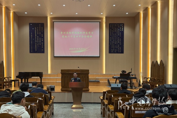 2025年10月27日,贵州圣经学校组织全校师生学习贯彻党的二十届四中全会精神。学习会由贵州圣经学校副校长杨明章牧师主持,教务长杨兴品牧师全文领学党的二十届四中全会公报,副校长周仕忠牧师讲话并部署学习要求。
