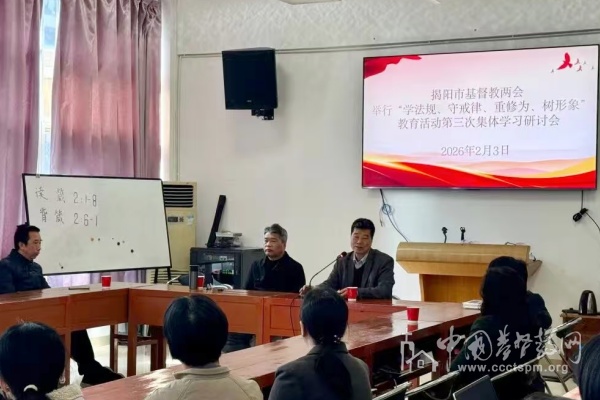 2026年2月3日,广东省揭阳市基督教两会组织直属堂教牧同工在真理堂召开“学法规、守戒律、重修为、树形象”教育活动第三次集体学习研讨会。