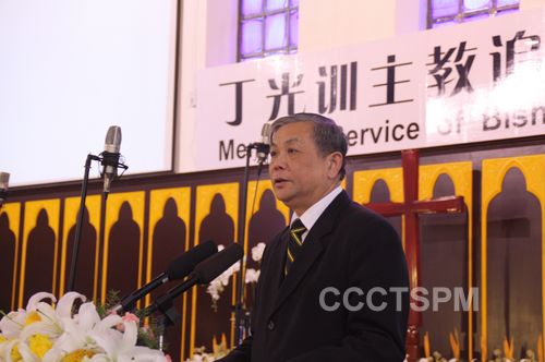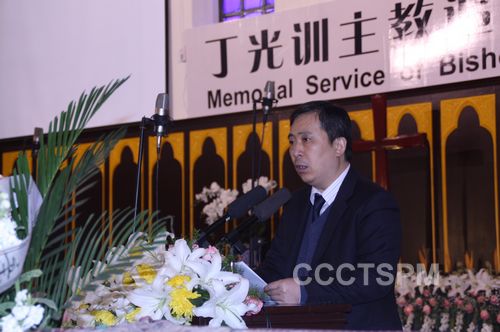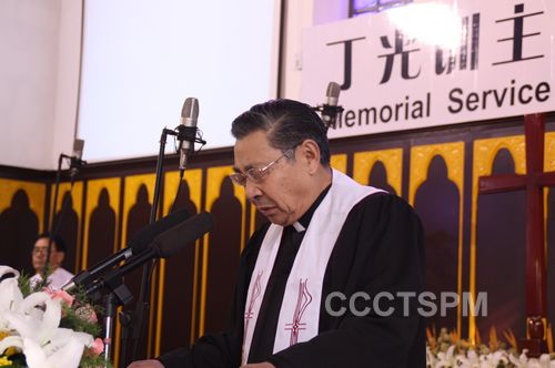 1时30分,序乐响起,追思礼拜正式开始。礼拜由中国基督教协会会长高峰牧师主持,原金陵协和神学院教授赵誌恩牧师祷告,南京市基督教三自爱国运动委员会主席、莫愁路堂主任牧师李兰成牧师宣读了旧约《以赛亚书》25:6-9,江苏省基督教协会会长张克运牧师宣读了新约《约翰福音》11:23-27,美国基督会亚洲区负责人朱晓陵牧师宣读了《启示录》14:13。中国基督教全国两会咨询委员会副主任邓福村牧师以“爱是永不止息”为题证道。邓牧师证道中说:丁主教的一生是奉献的一生,是将身体当作活祭的奉献,也是他的母亲(一位享年101岁的老姊妹)用祷告托住的奉献。他在中国教会60余年的侍奉中,积极参与了金陵协和神学院的筹建,提出了“从三自转入三好”,推动了中国教会的神学思想建设。丁主教非常重视读圣经,他还专门写了《怎样读圣经》一书来帮助弟兄姊妹读好圣经,并提出“圣经使我们联合”。丁主教的一生是爱国爱教的一生,为建设一个爱国爱教、荣神益人、健康发展的中国教会,他已鞠躬尽瘁,所留下的美好脚踪将激励我们奋力前进。