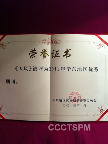 2013年1月31日,上海市期刊协会三届六次理事大会在上海市社会科学界联合会6楼会场举行。会上公布了2012年华东地区优秀期刊上海期刊名单,《天风》荣获华东地区优秀期刊称号。