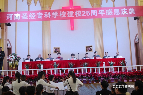 在圣经学校领导陪同下,国家宗教事务局和省宗教事务局的领导参观了圣经学校基础设施和校庆图片展后,于当日上午9:30-11:00,河南圣经专科学校25周年校庆感恩庆典隆重召开。河南省基督教协会会长胡俊杰牧师主持整个庆典程序,他首先介绍了出席庆典的嘉宾,奏国歌后胡牧师宣读了来自海内外的贺电贺信,宜阳乐队用民族乐器献乐“慈父上帝歌”,这首曲目正是宜阳县赵绍云牧师作词和作曲。河南圣经专科学校校长唐卫民牧师致辞欢迎各位嘉宾的与会,唐牧师回顾了河南圣经专科学校25年的风雨历程,它分为四个方面阐述了圣经学校的历史沿革:一、艰苦创业的洛阳时期;二、苦心经营的宋砦时期;三、全速发展的郑州开发区时期以及硕果累累的辉煌二十五载。