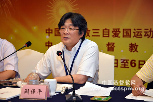 中国基督教协会副会长、总干事(代)阚保平牧师以“关于基督教中国化的探讨”为题发言。他围绕三自原则,提出自治的目标是实现自主办教,关键在于“办”,教会要发挥现有体制的优势。自养的目标是实现自力更生,即要做到经济独立。没有经济权的教会只是一个空架子,要发挥自身作用,保证牧养的自主性,就必须要有经济权、办教权。自传的目标是中国人自己在中国传福音,这就要解决自我身份的问题。他认为,若想要中国化,中国教会就要认同中国的文化、历史以及社会现实,并成为文化、历史和现实中的一部分。中国教会长久以来一直处于“半自我、半寄生”的状态,并未完全摆脱洋教的思维方式和行为方式,基督教要中国化,就要改变这一点,要完善自我意识,成为一个独立存在的主体,要改变洋教的存在方式,从改造社会到服务社会。