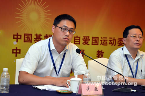 上海市浦东新区基督教两会办公室副主任,浦东新区鸿恩堂、灵恩堂许磊传道以“当代基督教中国化的‘格’与‘义’——兼澄清基督教中国化中的几个问题”为题发言。他通过审视宏观历史中基督教中国化的进程,指出基督教中国化已非简单的儒学化,而是一个与中国社会进程同步的动态过程。他选取“中国梦”表述作为当代社会发展特征,作为基督教中国化思考的切入点,提出社会是流变的,基督教中国化是三自爱国运动与神学思想建设发展与深化的过程,以此改变基督教等同于西方文明的误读,逐渐建立、清晰中国化的基督教范式。