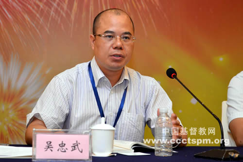 广州市基督教协会总干事吴忠武牧师以“浅谈基督教的中国化——谨以此文纪念中国基督教三自爱国运动委员会成立60周年”为题发言。他指出,在社会政治层面,基督教要适应中国特色的政教关系,树立正确的民族国家意识,在与社会主义社会相适应的道路上明确自己的立场。在思想文化层面,基督教要适应符合社会要求的文化关系模式,明确文化建设的主体和载体,把握与中国文化交流的内在机理与精神实质。在社会实践层面,基督教要将基督教的慈善公益事业、基层基督教的民间化和基督徒的信仰见证等视为实践意义上基督教中国化的体现。